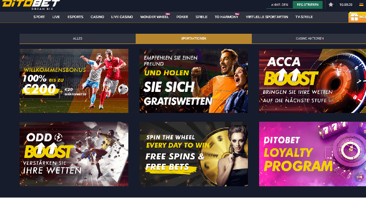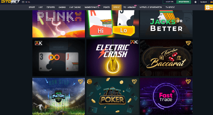 Das Ditobet Casino bietet ein fantastisches Design und Stil, was das Durchsuchen einfach macht. Grau und Goldgelb sind die verwendeten Farben, die beide sehr ästhetisch sind. Um andere Seiten der Website zu besuchen, verwenden Sie die Links auf der Homepage. Oben auf der Website befinden sich Links zu Sport, Casino, Esports, Live Casino und Poker. In der unteren rechten Ecke der Website befindet sich ein schwebendes Live-Chat-Symbol. Es ermöglicht Ihnen, mit dem Support-Personal in Kontakt zu treten und umgehend Antworten zu erhalten.