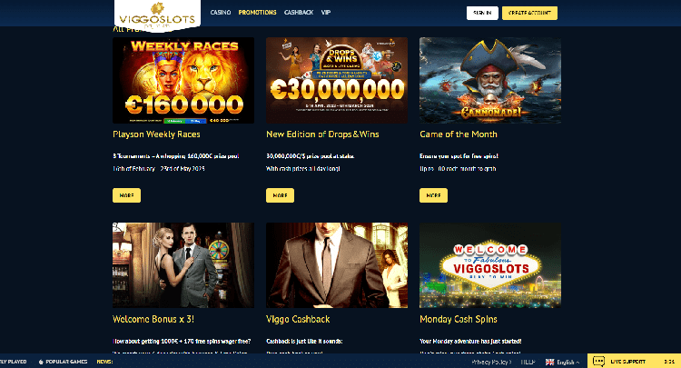 Viggoslots Casino wurde 2017 gegründet und ist ein Online-Casino. Das Casino bietet eine riesige Auswahl an Spielen von verschiedenen Softwareentwicklern, darunter NetEnt, Microgaming, Betsoft und viele mehr. Spielautomaten, Tischspiele, Videopoker und mehr Spiele stehen den Spielern zur Verfügung.