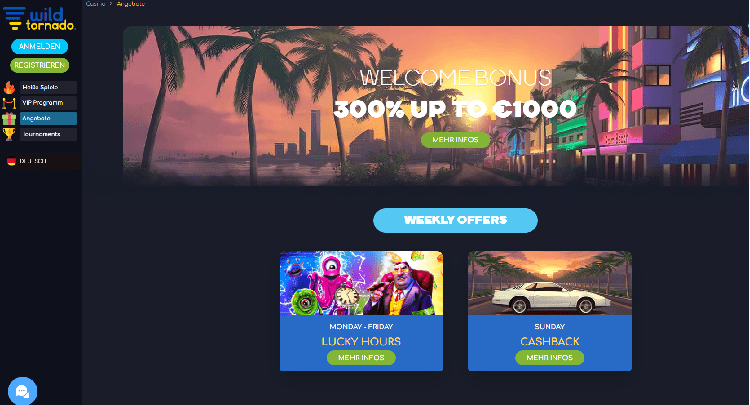 Tatsächlich bietet Wild Tornado Casino brandneuen Spielern ein Willkommensbonuspaket. Die Besonderheiten des Willkommensbonus können je nach Standort variieren, aber im Allgemeinen wird der Bonus auf Ihre anfänglichen Casino-Einzahlungen angeboten und kann Bonusgeld und Freispiele an bestimmten Spielautomaten beinhalten. Für bestehende Kunden kann das Casino auch zusätzliche Werbeaktionen und Anreize anbieten, wie z. B. Cashback-Angebote, Reload-Boni und Freispiele. Um über die neuesten Angebote auf dem Laufenden zu bleiben, wird empfohlen, häufig die Promotion-Website des Casinos zu besuchen.