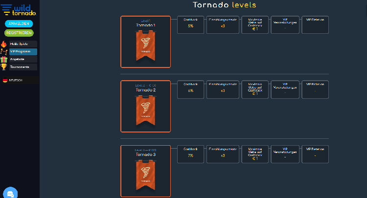 Insgesamt ist das Wild Tornado Casino ein zuverlässiges und vertrauenswürdiges Online-Casino, das Spielern aus der ganzen Welt ein erstklassiges Spielerlebnis bietet. Es lohnt sich auf jeden Fall, es sich anzusehen, wegen seiner vielfältigen Spielauswahl, praktischen Zahlungsmethoden und häufigen Boni und Werbeaktionen.