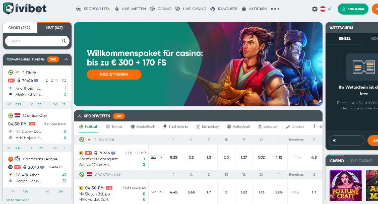 Spieler im Ivibet Casino haben die Möglichkeit, Wetten auf eine breite Palette von Sportveranstaltungen zu platzieren, darunter Fußball, Basketball, Tennis und eine Reihe anderer Sportarten zusätzlich zu den traditionellen Casinospielen, die angeboten werden. Die Benutzeroberfläche des Sportwettenanbieters wurde so gestaltet, dass sie einfach und unkompliziert ist, und die Benutzer haben Zugriff auf eine breite Palette von Wettmöglichkeiten, wie z. B. Live-Wetten, Wetten vor dem Spiel und Wetten auf den Gesamtsieger.